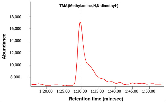 Chromatogram of trimethylamine (TMA) levels for texture-modified yellowfin sole by quantitative analysis using HS–SPME GC–MS.