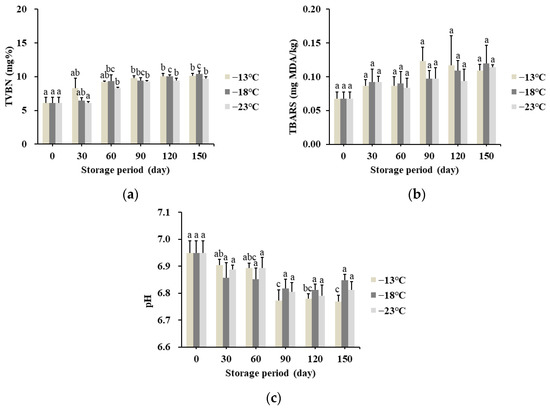 The pH changes of the texture-modified yellowfin sole in the test period are shown in Figure 3c. Overall, the pH values displayed a decreasing trend at all storage temperatures for 150 days, which may have been caused by accumulation of lactic acid resulting from glycogen breakdown in fish muscle. The decreasing pH during frozen storage was also observed in the study by Shi et al., (2020) [56], in which channel catfish exhibited a decrease in pH over eight weeks. Meanwhile, a significant pH change was confirmed in only one storage condition (−13 °C), ranging from 6.95 to 6.77 for 150 days. Eventually, these results gradually approached the normal pH range of fish (5.5–6.6).