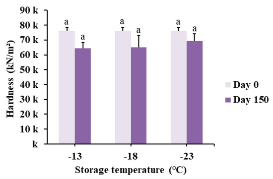 Changes in the hardness property of texture-modified yellowfin sole stored at different temperatures (–13, −18, and −23 °C). Data are presented as mean ± SE. The letter (a) indicates significant differences among means by Tukey’s test (p < 0.05); ■ 0 day storage, ■ 150 day storage.
