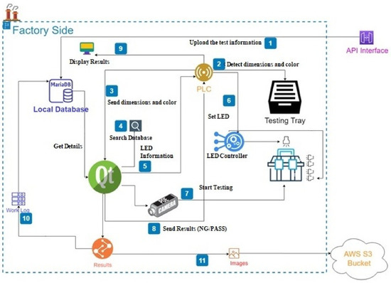 - In step 1, the application program interface (API) executable is started to upload the test information. In step 2, the PLC as the main hardware controller checks for the input materials specification is added (dimensions and color) related to the test sample. In step 3, the PLC forwards the detailed request to the central software server as a quality terminal (Qt). In step 4, the Qt feeds the requested samples tests data to the local database for storing the details of the sample test as records. In step 5, as per the input sample size and color, the LED light values are set for the appropriate best condition illuminations.