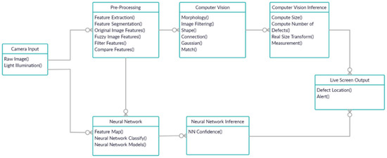 The ALDB-DL system model (Figure 3) contains four elements, the input to the system, AI landing for the manufacturing system, detection and classification using computer vision, deep learning, and live screen defect detection for industrial processes.