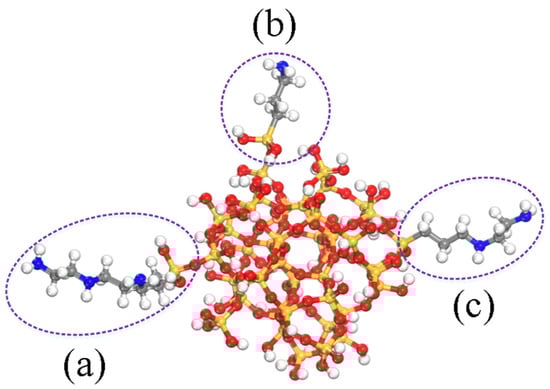 We used materials simulation software for model building and parameter calculation. Pure epoxy resin model, a nano-silicone epoxy resin composite model, and a nano-silicone epoxy resin composite model with surface grafting of KH550, KH792, and TAPS were built using the Amorphous tool. The Forcite module was used to optimize and anneal the constructed model. (1) In the Amorphous cell module, we added DGEBA and MPD by a ratio of 2:1 and set the density as 0.6 g/cm3. We chose the COMPASS force field as the calculating force field [31,32] and built the three-dimensional periodic box. After geometrically optimizing the constructed model, we first performed the 500 ps NVT calculation (the particle number N, volume V, and temperature T of the system remain constant), and then performed the 500 ps NPT calculation (the particle number N, pressure P, and temperature T of the system remain constant). Finally, we used the Perl script for crosslinking, presetting the crosslinking degree as 95%. (2) We chose the nano-SiO2 particle with a particle size of 10 nm for hydrogenation, built a nano-box of 50 × 50 × 50 Å3, and built the model according to the method in (1). (3) We grafted KH550, KH792, and TAPS on the surfaces of the nanoparticles hydrogenated in (2), respectively. The grafting density on the surface of nanoparticles was 10%. The model was built according to the steps in (1). A Nosé thermostat was used for temperature control, and the Berendsen method was used for pressure control.