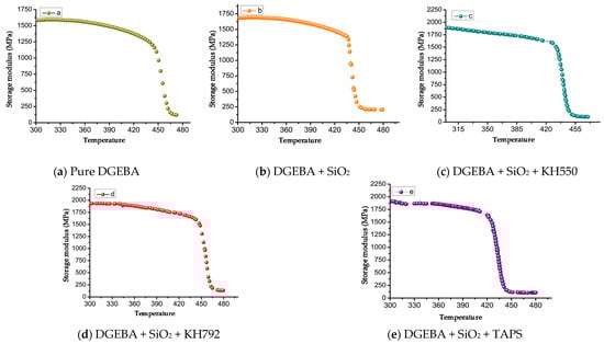 Figure 3 shows the storage modulus of the five models at different temperatures. It can be seen that the storage modulus of the five groups of models decreased as the temperature increased. In the beginning, the decrease was relatively gentle. When it reached a certain temperature, a sharp decrease appeared, which should be related to the glass transition temperature of materials. The storage modulus of the five models a, b, c, d, and e at 300 K are 1680 MPa, 1720 MPa, 1879 MPa, 1956 MPa, and 1915 MPa, respectively. After the silane coupling agent was grafted onto the surface of the nanoparticles, the storage modulus was effectively increased, among which the grafted KH792 had the most obvious improvement of 276 MPa over the pure epoxy resin.