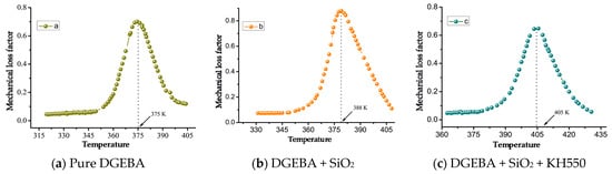 It has been shown that the number of hydrogen bonds formed between SiO2 nanoparticles modified on the surface of silane coupling agents and epoxy resins is greater than the number of hydrogen bonds formed between unmodified SiO2 nanoparticles and epoxy resins [33]. The formation of hydrogen bonds enhances the compatibility between SiO2 nanoparticles and epoxy resin and improves the dispersion stability of the nanoparticles in the epoxy resin. Therefore, the surface-modified nano-SiO2/epoxy composites have a large energy storage modulus.