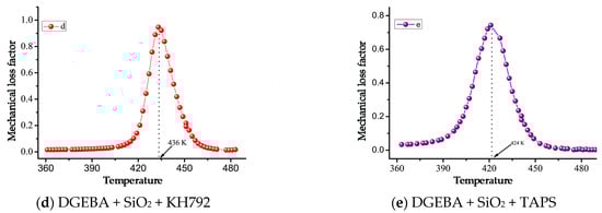Glass transition temperatures: (a) Pure DGEBA, (b) DGEBA + SiO2, (c) DGEBA + SiO2 + KH550, (d) DGEBA + SiO2 + KH792, (e) DGEBA + SiO2 + TAPS.