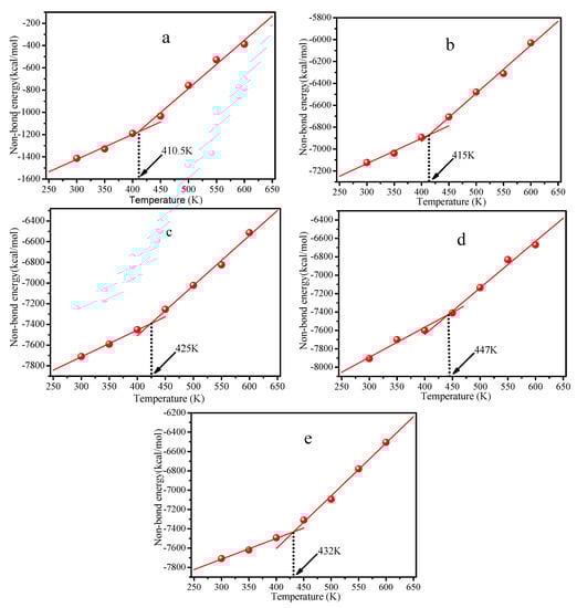 The glass transition temperatures of the polymers can be calculated from the interaction energy [34,35]. Figure 5 shows the glass transition temperatures of the SiO2, A1100, A1120, and A1130 models calculated through the linear fitting relationship between non-bond energies and temperatures. The simulation results are shown in Table 3.