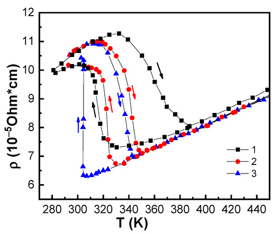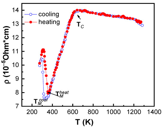 Figure 1 shows the temperature dependence of resistivity for a sample in cooling and heating protocols. The resistivity ρ decreased abruptly in the temperature range of 327–375 K (read line, heating), indicating the transition from AFM to FM state. The temperature TMheat = 353 K corresponded to the minimum ρ(T) in this range. Further heating resulted in an increase of the resistivity ρ(T) with a maximum at around of TC = 642 K. This corresponded to the transition into the paramagnetic (PM) state. Further heating up to ~1300 K led to slow decreases in resistivity.