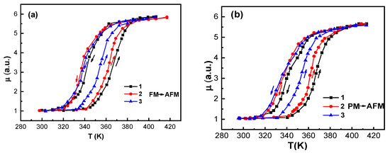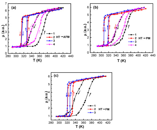 Figure 5 depicts the temperature dependences of the magnetic permeability µ for samples of Fe49Rh51 alloy with different exposure times. A typical quenching curve was obtained for a short exposure time of 5 min at T1. In this instance, the hysteresis area was slightly different from that of annealed and slowly cooled samples. The shift of the hysteresis area of quenched samples toward lower temperatures was observed for an exposure time of at least 440 min. Moreover, the tendency of the µ jump to decrease for quenched samples was observed with an increase in exposure time, and, therefore, with a decrease in the transition temperature.