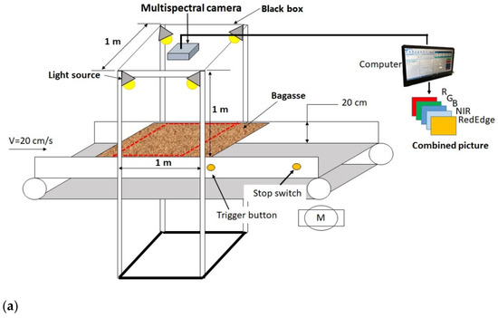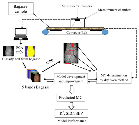 The experimental procedure of real-time MC measurement of bagasse using multispectral images was illustrated in Figure 2. Before capturing, the sample was mixed thoroughly to ensure homogeneity. Images were acquired as follows: (1) the light source was turned on and left for 5 min to ensure a stable light, (2) approximately 3 kg of SB was poured onto the conveyor belt, (3) the dark and white references were collected, (4) the conveyor belt switch was turned on (belt velocity of 20 cm/s) and (4) the bagasse image was captured while the sample was moving under the measuring chamber. The images, collected with five bands (R, G, B, NIR, and RedEdge), were arranged into a 3D format using MatLab (license no: 40846673, MathWorks, Natick, MA, USA). The image resolution was 1280 × 960 pixels with 16-bit.