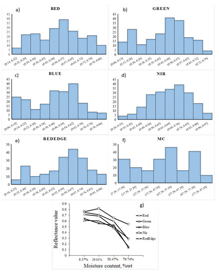 Histogram of relative reference value for (a) red; (b) green; (c) blue; (d) NIR; (e) RedEdge; (f) moisture content; (g) the relationship between relative reflectance value and moisture content.