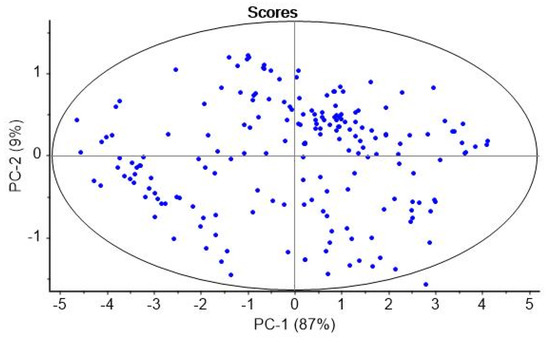 Max denotes maximum; Min denotes minimum; AVE denotes average; SD denotes standard deviation; MC denotes moisture content. The histogram in Figure 3a–f shows the pixel intensity distribution of the bagasse for the red, green, blue, NIR, and RedEdge, respectively. Figure 3g shows the relationship between the intensity of the relative reflectance and the MC of the bagasse sample—it can be seen that the relative reflectance decreased with increasing in MC. This means that bagasse with much higher moisture content absorbed light more than a lower MC sample. Correlation between the relative reflectance value of a multispectral image and moisture content was demonstrated in Table 2, which shows that the red band had a strong correlation with MC, followed by RedEdge, green, NIR, and lastly, the blue band. All image bands correlated negatively with moisture content, meaning that as the moisture content of bagasse increased, reflectance from the sample decreased. It could be indicated that water was a strong light absorber and a very good absorber in the visible and IR region [21]. Figure 4 shows the principal components of the relative reflectance image for the bagasse sample. The first two principal components, accounting for 96% (87% + 9%), showed that the sample distribution was very wide and these samples were good representative samples [22].