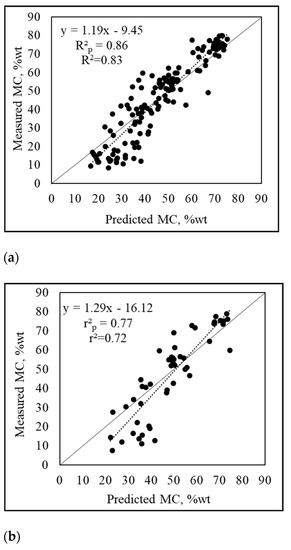 Figure 5a,b shows the scatter plot between the reference value and predicted value of the calibration and validation sets, respectively, illustrating the coefficient of determination (R2 = 0.83 and r2 = 0.72) and Pearson’s coefficient of determination (Rp2 = 0.86 and rp2 = 0.77). As a result, that the use of the prediction model in lower moisture contents (moisture content < 20%wt) was not recommended due to the fact that the predicted value was more than that of the measured value. There is information to support [23]—the absorption coefficient became higher with increasing moisture percentage. Therefore, for lower moisture contents, there was less absorption.
