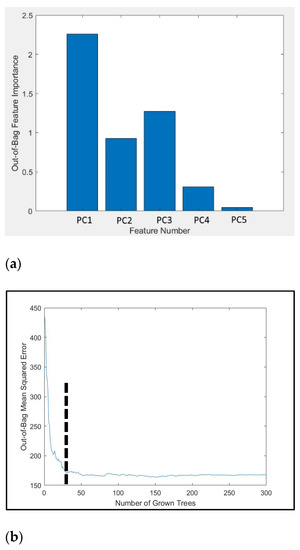 Figure 6a shows the important feature including PC1, PC2, PC3, PC4 and PC5. The figure shows a bar chart plotted between the out-of-bag feature importance and PC-score, which showed that feature number 1 (PC1) was the most important in prediction, followed by PC3, PC2, PC4, and PC5. It is a fact that PC1 was the direction with the largest variance and was the most important. The optimal tree number and mean squared error (RME) is demonstrated in Figure 6b. This showed that the number of tree of 30 was optimal due to starting with a constant value of RME and providing a low RME.