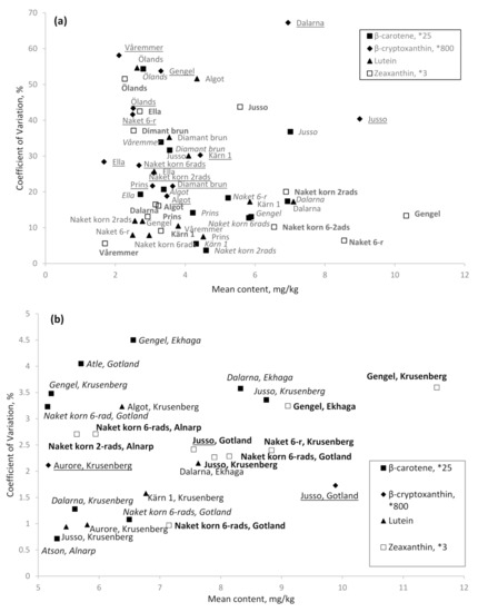 Mean content of carotenoid compounds and stability measured as coefficient of variation of evaluated cultivars over cultivation localities (a), and of high mean content cultivars within a specific cultivation locality (b). Multiplication numbers given after each carotenoid compound name indicate factor used to obtain similar scale of mean content for the different compounds. Italic, underlined, normal, and bold text indicate mean content of β-carotene, β-cryptoxanthin, lutein, and zeaxanthin, respectively, for the different cultivars (+locations).