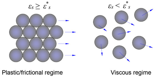 The fluid-like representation of the solid phase in Equation (10) requires equivalent values for the pressure field, shear viscosity, and bulk viscosity similar to those of the fluid phase. However, obtaining these equivalent values is not as straightforward considering the inherently discrete (particulate) nature of the solid phase. Therefore, closures are needed to express the behavior of the solid phase (e.g., contact pressure and collision) in terms of continuous pressure and viscosity. One of the most adopted approaches to achieve this is the Kinetic Theory of Granular Flow (KTGF) [17,29,30]. Before incorporating the KTFG to obtain the needed closures, we first need to identify two main granular flow regimes: (i) plastic or frictional flow and (ii) viscous flow (Figure 1). In the plastic flow regime, particle contact forces are dominant, which is suitable for capturing the behavior of static or quasi-static systems where no significant deformations take place. In the viscous flow regime, solid particles are considered to be in a state of fluidization, that is, particles are no longer in contact, and their movement is only affected by collisions and interaction between the particles and the surrounding fluid.