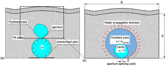 Schematic diagrams of soil fluidization in the vicinity of a leaking pressure pipe: (a) illustration of the formation of internal fluidization; (b) a conceptual representation of the fluidization parameters around the aperture.