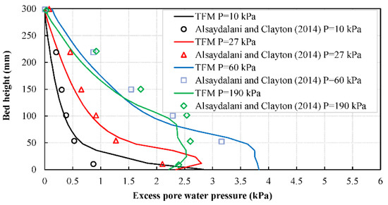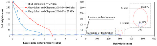 The upstream pressure required to initiate fluidization reported by Alsaydalani and Clayton [11] is approximately 100 kPa at a distance of 10 mm from the inlet and is characterized by the occurrence of a pressure drop at 53 mm from the inlet. In the current analysis, however, the occurrence of the first pressure drop was observed at upstream pressure of 27 kPa and a distance 11.3 mm from the inlet (Figure 5). Although this pressure seemed to be much lower than that measured in the experiment, it was noted that the experimental excess pore water pressure data were measured using probes, of which, the lowest was placed at a height of 10 mm and 53 mm from the inlet. At the inlet location, however, pressure measurements were not available, as placing a probe at the inlet will block the flow. Therefore, experimental detection of pressure drop initiation could only be obtained by comparing the first two probes, while pressure variations near the inlet were not accounted for. It was also observed that, above the location of the first probe, the simulation results seemed to agree quite decently with the experimental data (Figure 4). This suggests that fluidization had already started at an upstream pressure of 27 kPa but was not captured due to limitations in pressure measuring tools, where the pressure drop was reported exactly at the same distance of the second measurement probe. This was confirmed by the good agreement observed between the simulation and the experiment at upstream pressure of 190 kPa, at which the pressure drop occurred above 53 mm from the inlet location. A more important implication of the results was that the fluidization can happen within a limited domain around the location of the leakage. Although this was hardly observable at a relatively short distance from the leakage source, the increase in excess pore water pressure affected the entire sand bed, implying a significant reduction in effective stresses and shear strength of the soil.