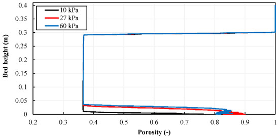 Porosity distribution along the bed centerline for upstream pressure values 10, 27, and 60 kPa.