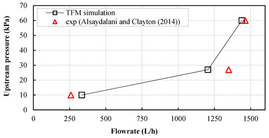 Flowrate was calculated for each upstream pressure boundary value upon achieving a steady-state flow similar to that followed in the experiment. It was obtained by multiplying the inlet velocity by the width of the slot as for two-dimensional simulation. The results for flowrate compared to the experimental results are shown in Figure 6. It can be observed that the calculated flowrates deviated from the experimentally measured values by 29%, 10%, and 1.5% for upstream pressures of 10, 27, and 60 kPa, respectively. This discrepancy was most likely caused by the different approaches adopted in calculating the flowrates in both the model and the experiment. For the experimental results, the flowrate was obtained by measuring the volume of water passing through the bed over 5 min at steady-state flow condition. This essentially accounted for water flow through the entire sand bed during the 5 min period as opposed to the calculated values of inlet velocity multiplied by the slot width. Other reasons might arise from velocity averaging in the TFM and the two-dimensional simulation instead of a more accurate three-dimensional representation. Overall, the results indicated that the model can reasonably reproduce results comparable to those measured in the experiment. Interestingly, both the experimental data and numerical simulation indicated a relatively high increase in flowrate beyond 27 kPa, which, again, suggests that fluidization occurred at a much lower pressure than experimentally reported.