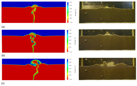 A comparison between the simulated sand boiling and the experimental photographs for flowrates (a) 700 L/h, (b) 900 L/h, and (c) 1200 L/h for bed height 150 mm and orifice opening 0.33 mm.