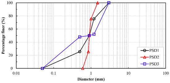 The numerical results presented thus far in this study only consider mono-dispersed granular soils. Although the effect of particle size variations has been reported both experimentally and numerically [11,12], uniform particle size was always used for each simulation case. This uniform particle size is characterized by an average value or more precisely the 50th percentile of particle sizes (D50). The outstanding question is how representative this uniform value is of a granular assembly, especially with different assemblies that share the same D50. To answer this question, we synthesized three different particle size distributions (PSD1, PSD2, and PSD3) such that they all had the same D50 (Figure 8). The particle size distributions were designed to represent three different soil types. The distribution PSD1 represented a well-graded soil with particle diameters ranging from 0.5 to 3 mm. The distribution PSD2 was also well-graded; however, it had a narrower range of particle sizes to mimic fine sand. The same particle size range of PSD1 was used for PSD3, but instead it was characterized by two particle sizes of 0.5 and 3 mm to represent gap-graded soil. Three cases were conducted using the same system described earlier for the three particle size distributions with a slot opening of 3 mm. A summary of the synthetized particle size distributions is provided in Table 3. At the inlet boundary, a water jet of a constant velocity of 3 m/s was set. The inlet velocity was set to be relatively high such that water jet penetration through the entire bed was achieved.