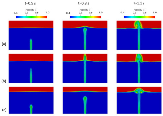 Another important aspect of the model’s performance that was tested here was its ability to capture high deformations and fragmentations. An example of this is sand surface boiling as a water jet of high velocity penetrates through the sand bed. The experimental results reported by Alsaydalani [9] included a qualitative description of surface boiling in a shallow sand bed. The experimental setup and simulation parameters were the same as those used previously, except for the sand bed height and slot opening, which were reduced to 150 mm and 0.33 mm, respectively. In this simulation case, a velocity boundary condition was imposed at the inlet to reproduce the flowrate boundaries of 700 L/h, 900 L/h, and 1200 L/h. For each case, the simulation results were displayed at the instant of water jet penetration out of the sand surface.