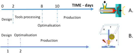 Comparison of the time needed to start the production process for injection molding technology (A) and rapid prototyping—3D printing, e.g., FFF (B).