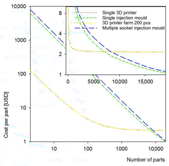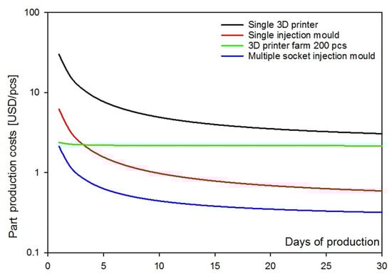 The calculation model was designed to simulate the most important production parameters, such as: unit production cost, total production volume vs. time, and unit production cost vs. total production volume. In order to achieve this, data on a variety of production parameters (e.g., tool cost, material cost, and unit production time, etc.) are collected in Table 2. Different scenarios were assigned for simulations, i.e., operating on a single FFF 3D printer, an FFF 3D printer farm, a single socket IM machine, or a multiple socket IM machine. These scenarios were chosen to discuss some production aspects, such as the total production output, production costs, or costs per production unit, when different production set-ups are applied, and how the changes of set-up affect these parameters (e.g., switching from a single FFF printer to a printer farm). Data such as the number of product units per 24 h, percentage of defective product units, and effective product unit output per 24 h were taken from our production tests made with a small 3D printing farm (10 pcs) for FFF, and an Engel injection molding machine for injection molding. Data on tools and designing were supplied by the industrial partner specialized in injection molding, STER INSTITUTE (Poland). Basics of the tool design and cost prediction may be found in the literature [49]. Equations (1)–(9) were assigned to run calculations.