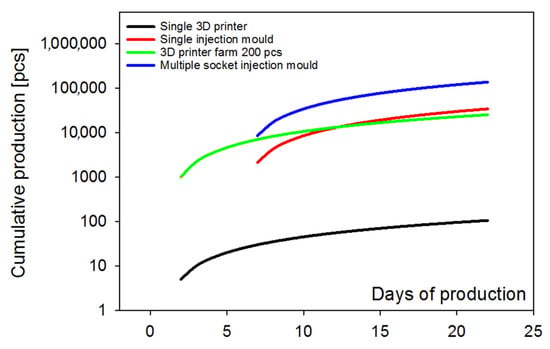 For the purposes of the simulation, data on operational, cost and performance parameters of selected processing methods were collected. The analysis included both the work of one tool (printer, single-socket mold, etc.), as well as the tool sets, such as the printer farm or a multi-socket mold (Table 2). These scenarios were selected to compare the aspects of different production approaches side by side and stress their limitations or shortcomings. Due to the significant technological differences between the FFF and IM techniques, it was not possible to use the same materials. Plastics dedicated to injection molding and FFF differ in terms of parameters and availability—it is not possible to obtain the same material for both techniques. As a result, material type and cost are different for the simulations provided for these two techniques and favour of injection molding. Per unit of mass, plastics intended for 3D printing are also much more expensive, which significantly increases the unit price of the product in case of FFF 3D printing. It is necessary to note that the project was carried out at the peak of the first wave of the COVID-19 pandemic outbreak in Poland and Europe, when the supplies of specialized materials were suspended, and the work was carried out using on-site available materials for the processing techniques discussed. The simulation presented in the manuscript shows the minimum time in which the discussed processing techniques can be implemented, which has been proven in real operating conditions.