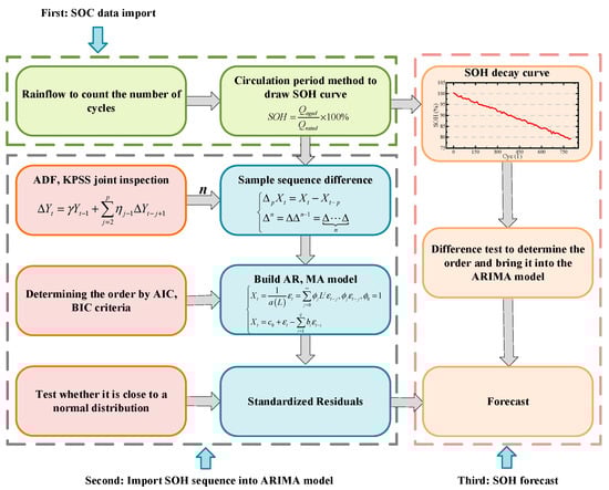 In Figure 1, the SOH prediction can be divided into three parts. First, import the data, and derive the SOH attenuation curve through the improved rain flow counting method. Then, import the obtained SOH sequence into the ARIMA model, and perform differential stationery, sequence determination, and residual test processing on it. Finally, the original data and the data processed by the model are integrated and predicted.