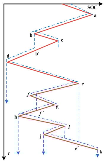 The main principle of the Rainflow algorithm is to imitate the process of raindrops falling along the eaves. When raindrops fall to the next eaves, a loop will be formed. The SOC time record shown in Figure 2 includes three complete cycles (b-c-bˊ, f-g-fˊ, and i-j-eˊ) and three half-cycles (a-b-d, d-e-eˊ, and e-f-h).