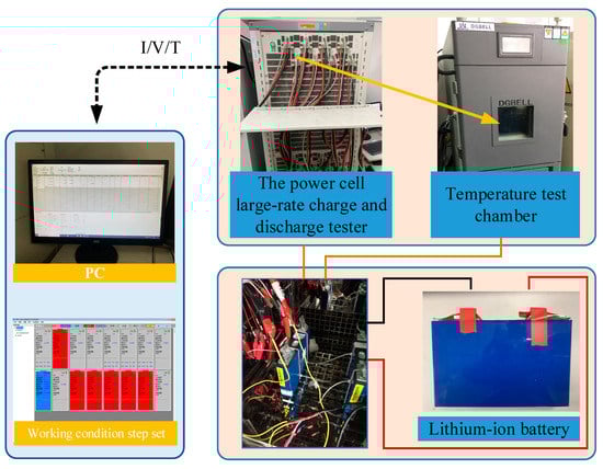 As shown in Figure 4, the ternary lithium-ion battery is placed in a thermostat and is connected to the power experiment device through a professional line. We set the experimental conditions on the PC side. The experimental platform is stable and reliable and has an automatic protection mechanism for power failure. Detailed experimental data can be obtained, including the current, voltage, capacity, time, temperature, energy, etc.