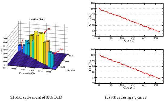 The cyclic median value in Figure 5a represents the average stress, and the calculation formula is shown in Equation (1). The end of life of a lithium-ion battery is defined as damage when the current full capacitance drops to 80% of the initial capacity. In fact, when the battery capacity is less than 80%, it can still be used, but the performance will decline. The meaning of the average stress here is that when the damage condition of the lithium-ion battery exceeds the defined value, the stress level should be reduced when in use, and one should avoid further deep discharge of battery, i.e., reduce battery load. Figure 5a shows the corresponding DOD of a lithium-ion battery under different average stress. Cyc represents the number of cycles, corresponding to the median value of each cycle of the battery, and the total number of cycles is 800 when all of the numbers are added. CYC is the number of cycles of the battery in each cycle median case, and the total number of cycles is 800. Figure 5b is based on the number of cycles obtained in Figure 5a using the cycle period method to draw the SOH attenuation curve.