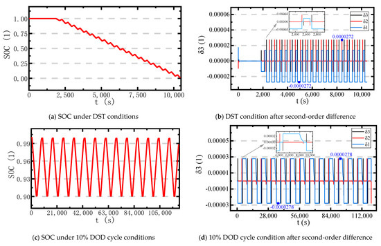 Figure 6a,c are the SOC curves under DST operating conditions and 10% depth-of-discharge cycle operating conditions, respectively. The joint test of ADF and KPSS in Figure 6b shows that the order of difference for the sequence to reach stationary is second. To verify the different test results, Figure 6b makes the first-, second-, and third-order differences on the sequence of Figure 6b δ1, δ2, and δ3 represent the first, second, and third order differences, respectively. The mean value of δ1 is unstable, δ3 is over-differentiated and there are many burrs, and only the mean value of the δ2 sequence is stable without unnecessary burrs. Figure 6d is the same, the second-order difference satisfies the second-order stationary condition.