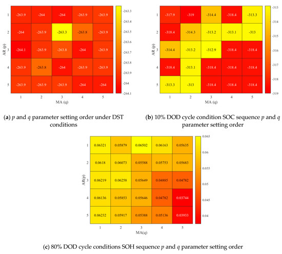 The optimal solution can be found intuitively in the form of a heat map. Finding the optimal solution through AIC allows for finding the minimum value. The minimum value in the heat map has the darkest color. The parameters corresponding to p and q in Figure 7a are 3 and 1, respectively. The parameters corresponding to p and q in Figure 7b are 1 and 2, respectively. The parameters corresponding to p and q in Figure 7c are 4 and 5, respectively. If the p or q order is selected too high, then k and L in Equation (9) will have an absolute effect on one side, which may cause the error of the ARIMA model to increase. Therefore, when the AIC criterion is used in this study, the maximum order is set to 5.