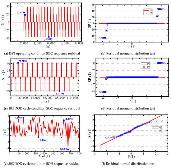 Figure 8a,c,e (are the residual sequence of samples under different working conditions, and Figure 8b,d,f are the Q–Q diagrams corresponding to the residuals of each working condition. SP represents the quantile of the input sample, and P represents the standard normal quantile. Compare the SP and P series to test whether the residuals are close to a normal distribution. Curve P1 represents the standard normal distribution, and curve P2 represents the distribution of the residuals. The higher the degree of overlap between curve P2 and curve P1, the closer the residual is to a normal distribution. It can be seen from Figure 8 that the residuals are close to the normal distribution under the three working conditions.