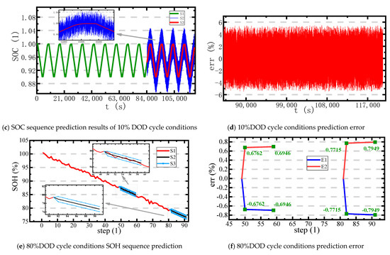 In Figure 9a, S1 represents the true value of the first 80% of the entire SOC sequence. The data of S1 are used to establish the ARIMA model, S2 represents the predicted value of 20% after the SOC sequence, and S3 is the true value of 20% after the SOC sequence, which is used for comparison with the predicted value of S2. Figure 9b shows the error between the predicted value and the true value. The prediction error is stable within 5.3160% under DST conditions. Figure 9c,d are similar, except that the ratio of the data used for modeling to the predicted data in Figure 9c is 7:3. The prediction error under 10% DOD cycle conditions is within 5.4517%. One unit of step in Figure 9e corresponds to 10 cycles of the battery; S1 represents the true value of SOH, S2 represents the predicted value, and S3 represents the 95% confidence interval. SOH is predicted when the lithium-ion battery is cycled 500 times and 800 times, respectively, and the predicted number of steps is 10 steps, that is, the prediction of 100 cycles in the future. As it is difficult for lithium-ion batteries to have sudden changes in SOH under normal use, and because of the non-linear characteristics of lithium-ion batteries, it is difficult to track SOH in real-time, so this paper draws the confidence interval to lock the error range of SOH, as shown in Figure 9f. E1 represents the error between the upper half confidence interval and the predicted value, and E2 represents the error between the lower half confidence interval and the predicted value. The results show that the prediction error for the next 10 steps is within 1%, that is, the SOH will fluctuate based on the predicted value and the amplitude will not exceed 1%. The method proposed in this study has a maximum prediction error of 5.4517% under these three conditions, which is 3.3% less than that in the reference [27] (the maximum error is 8.8%).