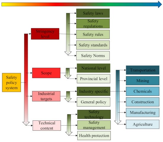 (1) Safety policies are classified into stringency categories, namely, safety laws, safety regulations, safety rules, safety standards, and safety normative documents. The industrial categories are transportation, mining, manufacturing, chemicals, construction, and agriculture. The technical categories include safety technology, safety management, and health protection. The scope of the policies is either at the national level or provincial level. Finally, the safety policy system is established.