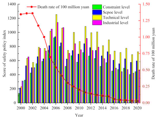 (1) From the aspect of policy stringency, safety policies are divided into the five levels of safety laws, safety regulations, safety rules, safety standards, and safety norms; it is clear that the legal effect of each successive level gradually declines, and these levels are assigned scores of 5, 4, 3, 2, and 1, respectively, which are the safety policy indexes for the level of policy stringency. (2) From the dimension of the scope of the safety policy, the safety policies are divided into the two levels of the national level and provincial level. When the scope of the policy is wider, its relative impact on accidents is greater. Therefore, the two levels are given scores of 2 and 1, for the national and provincial levels, respectively, which are used as indexes for the scope of safety policies. (3) The specific content of the safety policies can be divided into the three categories of safety technology, safety management, and health protection. Health protection has little impact on the number of accident-related deaths, while policies with high technology content are more conducive to the formation of a clearer understanding of personnel safety in the production process. Therefore, the technical content of the policy is defined as a safety policy indicator, and its scores are 3, 2, and 1 for safety technology, safety management, and health protection, respectively. (4) Finally, safety policies are directed toward various industries, and the proportion of accidents varies by industry. In terms of the number of deaths from 2000 to 2020, the ranking of the various industries is transportation, mining (including coal and noncoal mines), chemicals, construction, manufacturing, and agriculture, and therefore, this indicator identifies the industrial target of the policy, whose score is 6, 5, 4, 3, 2, or 1, respectively.