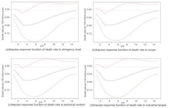 , a unit shock in the stringency level, scope, technical content, and industrial targets is given, and there is no external disturbance. Then, the change in the death rate per 100 million in the following period is analyzed. To eliminate the influence of variable order, a generalized pulse is used here, and the progressive analytical method is used to calculate the error. The results of the impulse response function are shown in