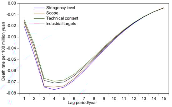 Figure 6. The figure shows that the safety policies had a rapid effect in the first two years, with the death rate per 100 million decreasing by 0.06. The effect reached its peak during the second to fifth years and began to weaken during the sixth year, with the death rate per 100 million decreasing by 0.05 in the fifth year. In the eleventh year, the effect was almost lost, as it reached zero. The ranking of the influence of each safety policy index on the death rate per 100 million yuan is, from strongest to weakest, the stringency level, scope, technical content, and industrial targets. This shows that when formulating safety policies, more stringent policies should be preferred, which can quickly arouse the attention of personnel in the early stages, especially since the effect of safety policy stringency on the death rate per 100 million yuan lasts longer than the effect of the other safety policy dimensions. At present, China’s safety policies are mainly based on department rules, and the number of safety laws and regulations is still insufficient. If we increase efforts in this area, then we can effectively reduce the death rate per 100 million yuan and significantly improve safety conditions.