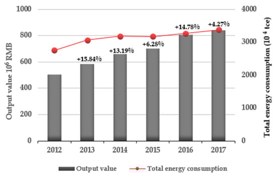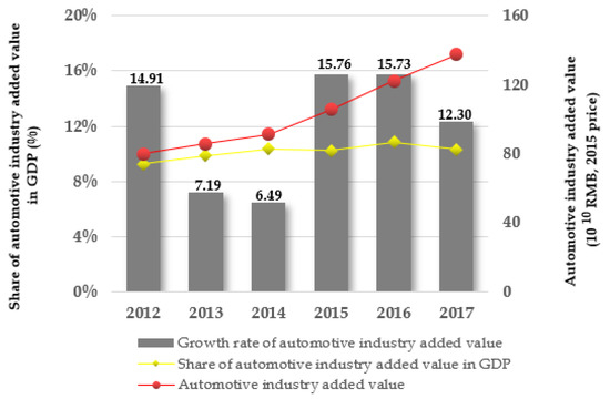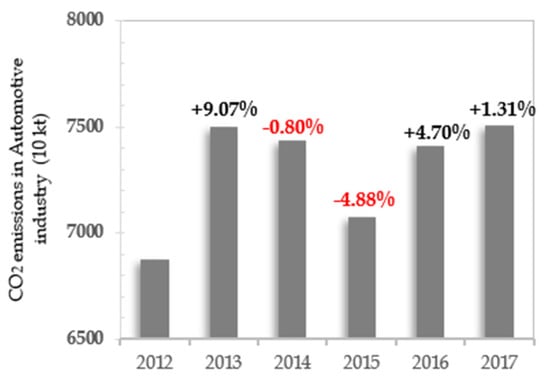 China has become the world’s superpower for automobile manufacturing and consumption. The automotive industry is a vital pillar industry in China’s national economy; since the reform and opening-up, the development and growth of China’s automobile industry has strongly promoted the rapid improvement of the national economy and has had a far-reaching impact on the gross industrial output value, social taxation, labor employment, industrial collaboration, technology upgrading and urban construction. Its competitiveness directly reflects the level of industrial manufacturing in an economy. From 2012 to 2017, the automotive industry in China experienced a rapid development. Its added value increased 1.7 times, and its contribution to GDP has been rising steadily [1] (see Figure 1). Compared with that in western developed countries, the automotive industry in China developed much later, but it is developing rapidly and has accounted for the largest number of new car production and sales for eleven consecutive years since 2009. After more than half a century of development, with the process of urbanization and the rising middle class, the demand for automobiles continues to rise and the automotive industry has played a vital role in the development of national economy. Figure 2 shows that the total value of output in the automotive industry grew from 5039 billion RMB (2015 constant price) in 2012 to 8404 billion RMB (1 USD = 6.8 RMB) in 2017, with an average annual growth rate of more than 10% [2,3]. Along with the further significant upside of the automobile consumption market, the automotive industry is facing many challenges, such as energy consumption and environmental damage [4,5,6,7,8]. With the increase in output value, there is also an increase in energy and resource consumption and the CO2 emissions (see Figure 3) [3]. Besides the enlargement of market demand, the increase of enterprises and the expansion of the industry are constantly putting pressure on the control of CO2 emissions and pollution treatment [9].