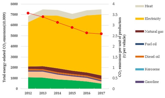 Figure 4 shows the CO2 emissions trail and annual emissions per unit of production for the automotive industry in China from 2012 to 2017. It can be clearly seen that coal makes a major contribution to direct emissions, while electricity is the main source of indirect emissions, and electricity is greater than coal, accounting for 76.57% of all energy-related carbon emissions in 2017. The proportion of coal consumption is gradually decreasing, while electricity consumption is increasing. Moreover, CO2 emissions from indirect sources (electricity and heat) have always been higher than those from direct sources, and the gap is gradually widening. Figure 4 shows that CO2 emission fluctuates, but, on the whole, it shows a slow upward trend. This change is related to the policy of that year. Starting in 2011, under the background of weak international economic growth, falling domestic economic growth and the gradual withdrawal of policies to stimulate automobile consumption, China’s automotive industry has been growing slowly and China’s automobile market has gradually transited from a rapid growth stage to a stable growth stage. From 2012 to 2017, the average increment of carbon emissions in the automobile manufacturing industry is about 8%. In addition, the emission per unit output is decreasing year by year, from 3.57 t/per vehicle in 2012 to 2.59 t/per vehicle in 2017. In particular, between 2013 and 2015, carbon emissions fell, while production was still growing, resulting in emissions per unit of production still falling. This is related to the implementation of energy-saving and emission reduction planning and vigorous development of energy-saving and new energy automotive industry in China. This progress shows that China’s emission regulations continue to be stricter, and efforts are made to vigorously promote green manufacturing, energy saving and consumption reduction technologies.