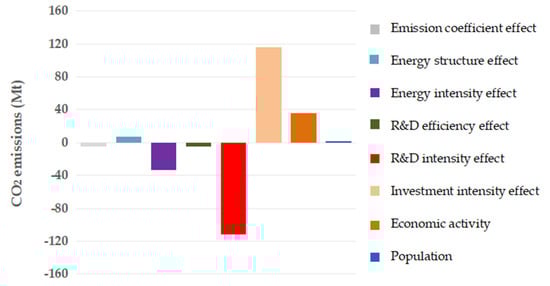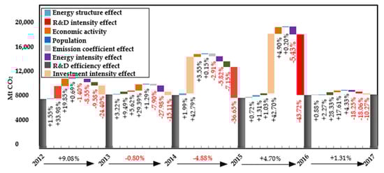 Figure 6 and Figure 7 show the overall and annual influences of various driving forces from 2012 to 2017, respectively. From the viewpoint of cumulative effect, the energy structure effect, investment intensity effect, economic activity effect and the population effect are the only four driving forces of emission growth, increasing by 7.04, 116.16, 35.40 and 1.93 Mt, respectively, during the period. On the contrary, emission coefficient effect, energy intensity effect, R&D efficiency effect and R&D intensity effect contribute to emission reduction. These factors contributed 5.06, 33.01, 4.58 and 111.59 Mt, respectively. According to Figure 7, the magnitude and direction of the driving forces vary greatly in different periods, and the expansion analysis of each factor is as follows.