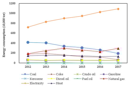 Energy structure effect:Figure 6 and Figure 7 show that this effect makes a positive contribution to CO2 emissions. As shown in Figure 4, the main emissions come from coal, coke, electricity and heat. Figure 9 shows that the consumption of energy from these four sources is relatively large. Coal consumption totally shows a downward trend and so does coke, while electricity shows the opposite. Heat is in a steady consumption trend. Comparing Figure 6 and Figure 8, it can be seen that natural gas consumption has exceeded coke since 2012, but emissions are always lower than coke, because the effective emission factor of coke is higher than the effective emission factor of natural gas. Therefore, the energy structure is closely linked with emissions [37,38,39]. For instance, the reduction of energy consumption with high emission factors such as coal and coke and the increase of energy consumption with low emission factors such as oil and gas will reduce emissions. Because of the serious imbalance of energy structure in China, considering the cost, coal is the most convenient and direct fuel to use, but it is not conducive to sustainable development, damages the environment and offsets the ecological benefits.
