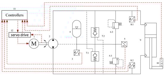 Schematic diagram of pump control system (PCS). 1: servomotor; 2: positive displacement pump; 3: low-pressure sensor; 4: accumulator; 5: temperature sensor; 6.1/6.2: relief valve; 7.1/7.2: pilot-operated check valve; 8.1/8.2: high-pressure sensor; 9: hydraulic cylinder; 10: displacement sensor; 11: controllers.