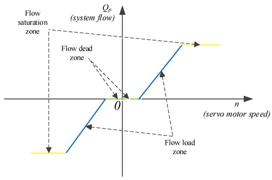 A PCS is a typical strong nonlinear system, and it is difficult to accurately model the system flow through a mathematical model. Therefore, we studied the output characteristics of the pump flow under different working conditions in different areas, which are specifically divided into the flow dead zone, flow load zone, and flow saturation zone. The flow output characteristic diagram is shown in Figure 2.