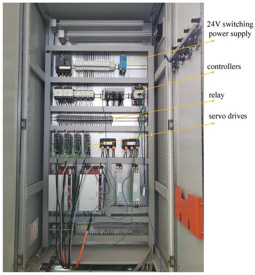 This paper relied on a pump-controlled hydraulic actuator experimental platform to conduct experimental research on the nonlinear characteristics of system flow. The electrical integrated cabinet included important electrical components, such as an axis controller, servo drive, and relay. The experimental platform is shown in Figure 3 below.