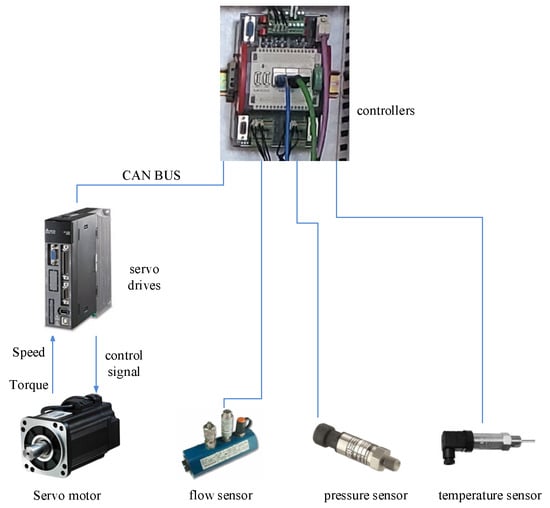 In this study, the pressure and flow of the hydraulic system are collected by pressure sensors and flow sensors, and the collected information is processed by the controller. Information such as the speed and torque of the servo motor is collected by the built-in encoder of the motor and then uploaded to the drive. After the drive is processed, it is uploaded to the controller for monitoring. The drive and the axis controller communicate through the CAN bus. A schematic diagram of the electrical structure is shown in Figure 4 below.