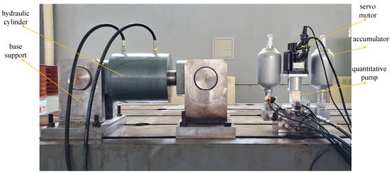 The hydraulic system integrates the SM, the positive displacement pump, the accumulator, and the hydraulic valve through the functional valve block. The loading of the oil cylinder is realized by the base support, and the hydraulic cylinder and the functional valve block are connected by hydraulic pipelines. The hydraulic test platform is shown in Figure 5 below.
